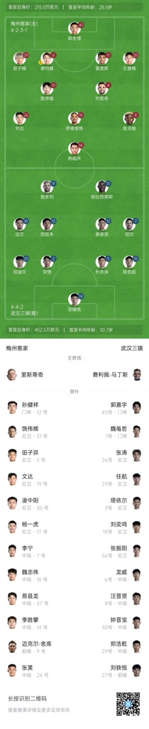 04月06日讯 今晚19:00,中超第五轮,梅州客家vs武汉三镇。双方首发阵容已公布。