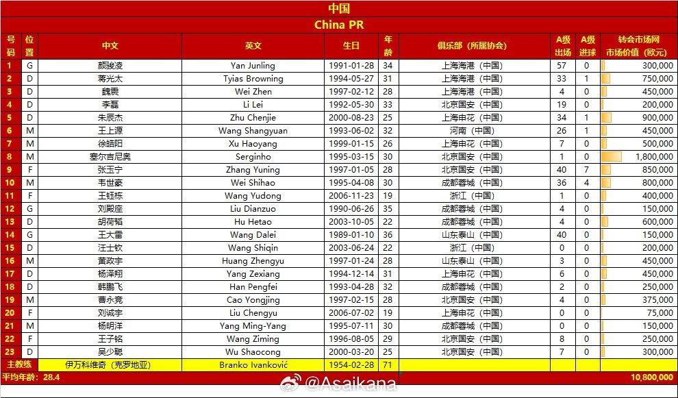 国足客战印尼23人大名单:韦世豪10号、塞鸟8号、王钰栋11号