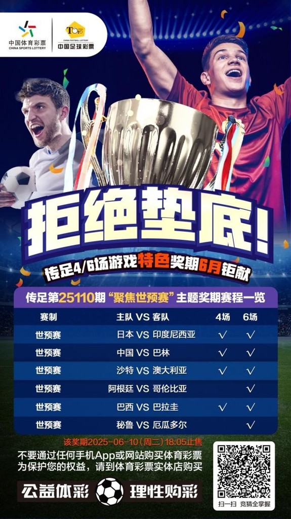 第25110期传足4/6场游戏特色奖期已经于2025年6月8日20:00开售,将于2025年6月10日18:05停售,并于6月11日开奖,其中日本VS印度尼西亚、中国VS巴林、沙特VS澳大利亚、巴西VS巴拉圭为4场进球游戏竞猜赛事。