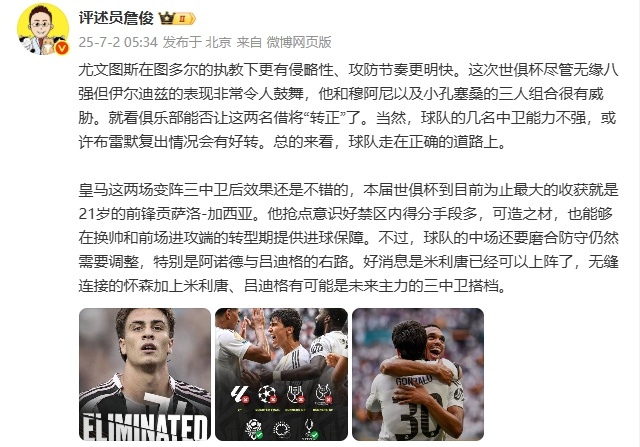 詹俊:尤文图斯在图多尔的执教下更有侵略性、攻防节奏更明快。这次世俱杯尽管无缘八强但伊尔迪兹的表现非常令人鼓舞,他和穆阿尼以及小孔塞桑的三人组合很有威胁。就看俱乐部能否让这两名借将“转正”了。当然,球队的几名中卫能力不强,或许布雷默复出情况会有好转。总的来看,球队走在正确的道路上。