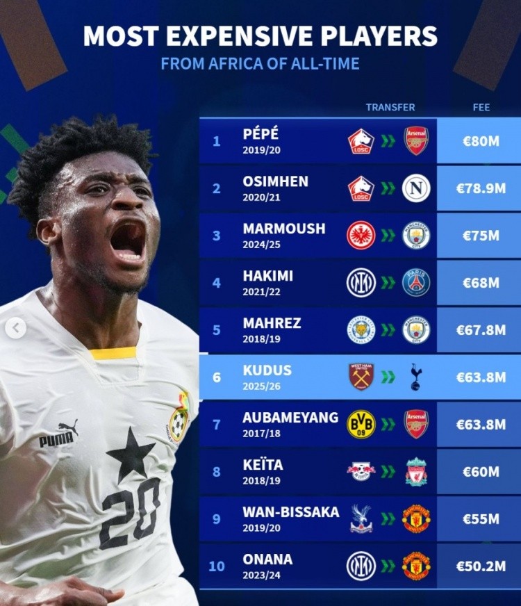 7月12日讯 热刺在昨日已经官宣签下西汉姆中场库杜斯,《转会市场》统计显示他也是非洲历史第6贵的球员。