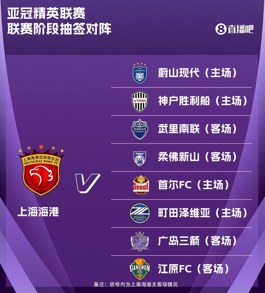 08月15日讯 25/26赛季亚冠精英联赛联赛阶段抽签,上海海港为东亚区的一档球队,联赛阶段的8支对手如下。