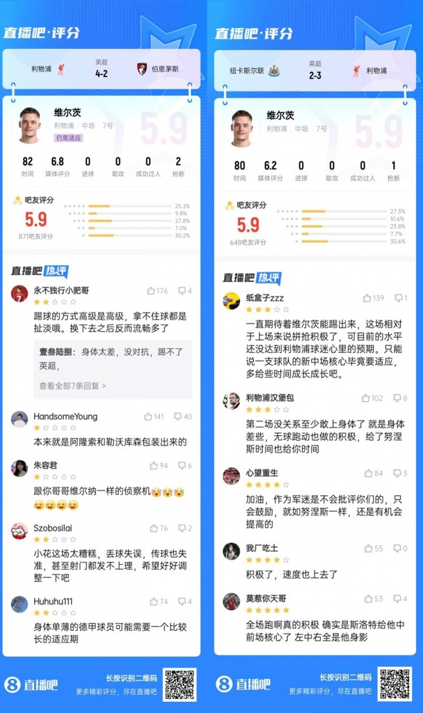 这两场比赛,维尔茨的球迷评分都仅有5.9分,但还是看到了他的进步,未来维尔茨能否发挥出符合身价的表现?