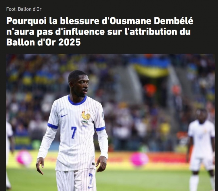 文章表示,今年金球奖典礼将于9月22日举行(北京时间9月23日凌晨),登贝莱目前是金球奖热门候选之一。《法国足球》金球奖评选规则第3条明确规定:“投票参考周期涵盖完整赛季,即2024年8月1日至2025年8月2日,包括在此期间的各项国际赛事。因此登贝莱伤势不会影响本期金球奖评选,评委们投票参考期并不包含球员本月的表现。