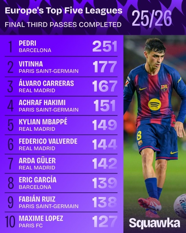 10月1日讯 数据网站Squawka统计本赛季五大联赛进攻三区完成传球数,巴萨中场佩德里断档领先,皇马4人进入前十。