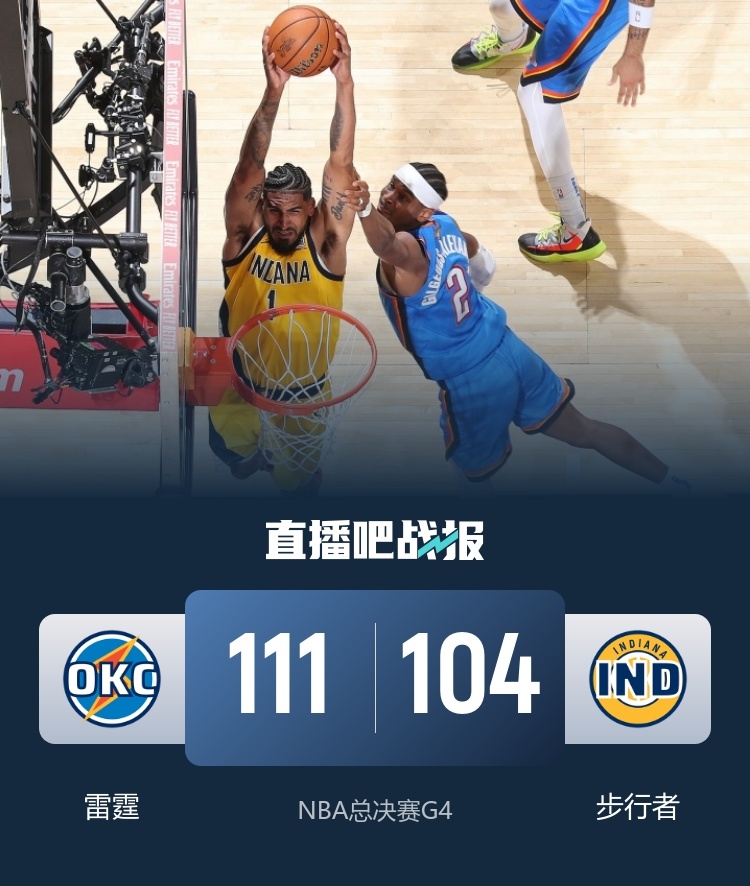 6月14日讯 NBA总决赛G4,步行者今日继续在主场迎战雷霆,目前大比分步行者2-1领先雷霆,后者此役将哈尔滕施泰因重新提到首发。