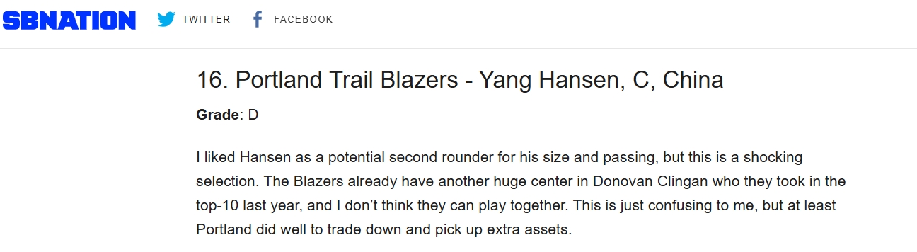 开拓者16顺位选择杨瀚森,SBNATION的选秀专家Ricky O’Donnell给出的评级是:“D。我喜欢杨瀚森作为一个二轮秀的传球能力和身板,但这(首轮16顺位)是一个令人震惊的选择。开拓者去年已经有了一个前十的中锋克林根,我不认为他们俩能一起上场打球。这就是让我看不懂,但至少开拓者是向下交易(选了杨瀚森)得到了一些额外的资产。”