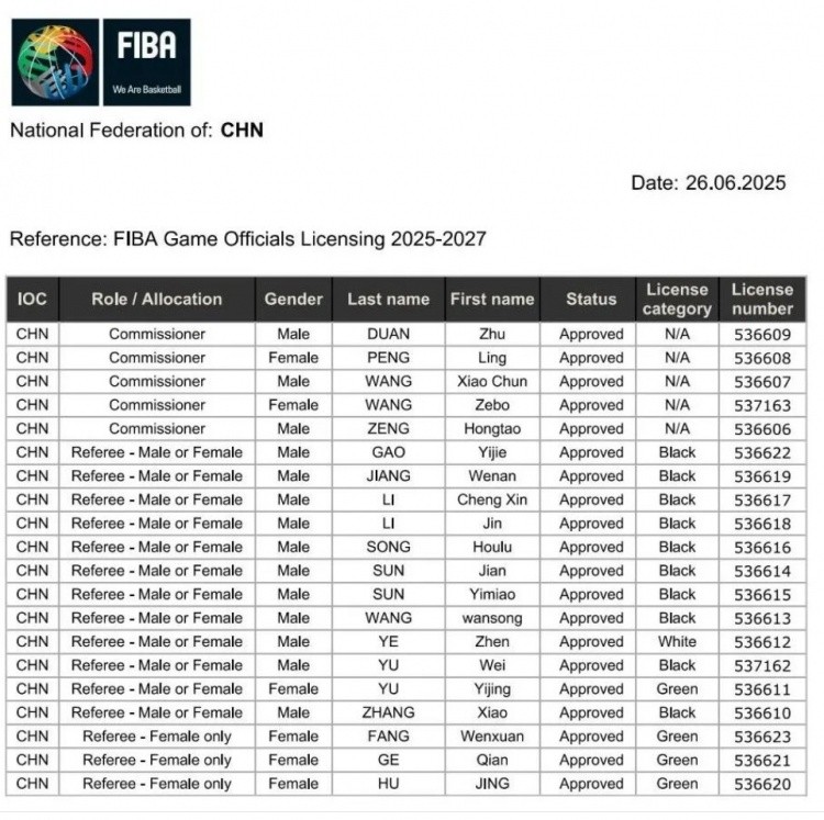 FIBA25-27周期全球篮球裁判员及临场代表注册中国名单:段铸领衔