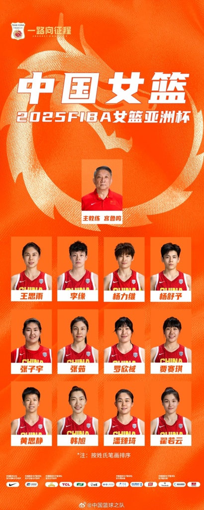 #中国女篮#公布出战2025FIBA女篮亚洲杯大名单。感谢所有运动员集训期间的不辞辛苦;感谢所有教练员、工作人员在备战期间的辛勤付出;感谢为中国女篮输送参训人员的各单位。7月13日-7月20日,中国女篮将再次出战女篮亚洲杯。团结一心,力争上游!