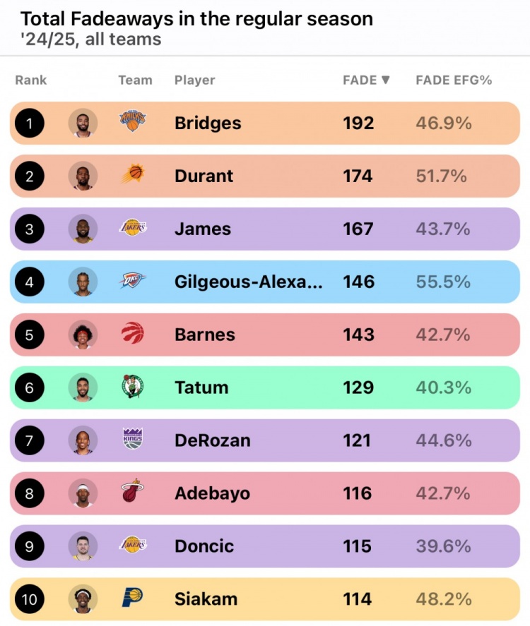 据统计,尼克斯的布里奇斯以 192 次后仰投篮排名联盟第一,杜兰特(174 次)、詹姆斯(167 次)分列二三位。而这10人之中,亚历山大的以 55.5% 的有效命中率是最高的。