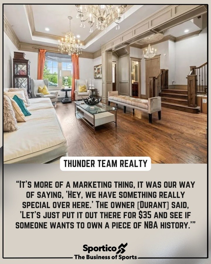 据报道,35美元的促销价格是对杜兰特在雷霆所穿的35号球衣的致敬,以此来吸引更多买家,目前尚未确定最终是否能以这个价格达成交易。该处房产的真实市场价格约为100万美元。