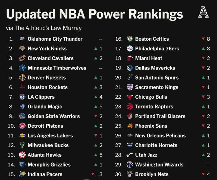 TA实力榜:雷霆榜首 掘5火6船7勇士9&湖人11 开拓者24