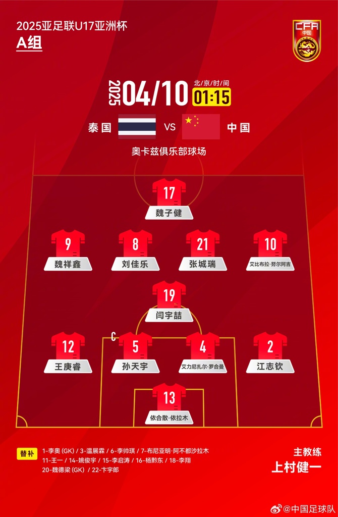 国足U17首发:13-依合散、5-孙天宇、4-艾力尼扎尔-罗合曼、12-王庚睿、2-江志钦、19-闫宇喆、8-刘佳乐、21-张城瑞、9-魏祥鑫、10-艾比布拉、17-魏子健