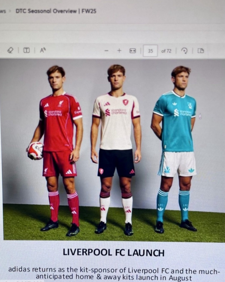 5月24日讯 著名足球装备网站Footy Headlines报道,利物浦球衣专家@KB2X泄露了阿迪达斯2025系列中利物浦2025-26赛季主场、客场及第三球衣的官方图片,设计大体与此前爆料一致,但领口和袖口细节有所调整。