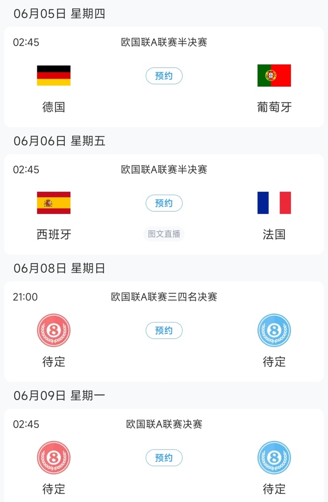 西班牙将于北京时间6月6日凌晨2点45对阵法国队,另一场半决赛是德国vs葡萄牙。