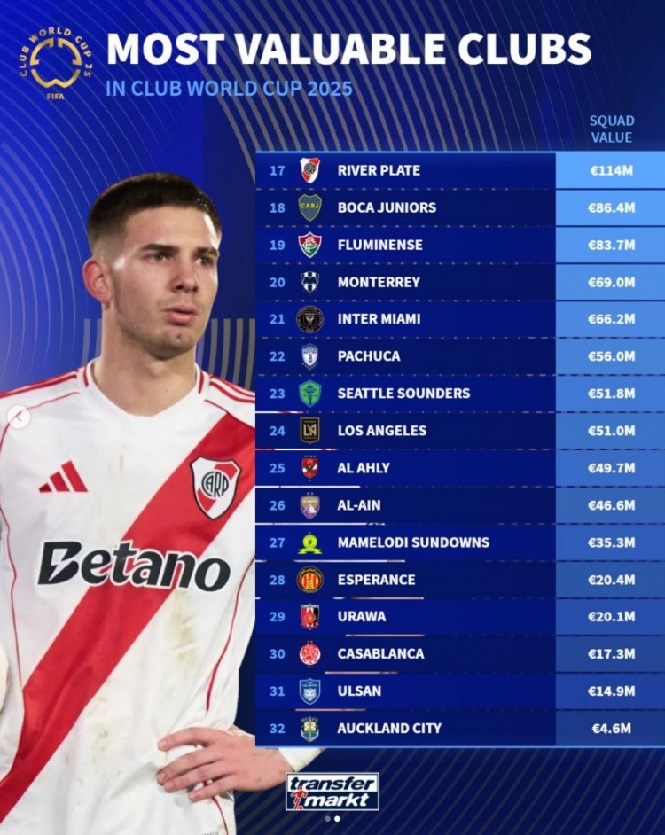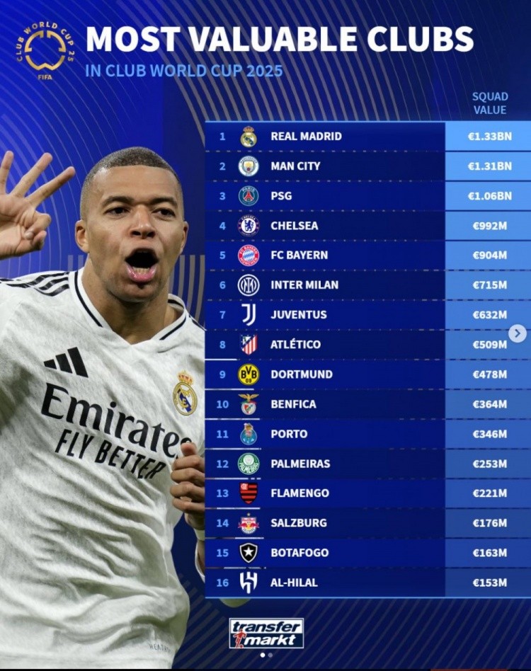 世俱杯各队身价排名:皇马13.3亿欧居首 奥克兰城最低仅460万欧