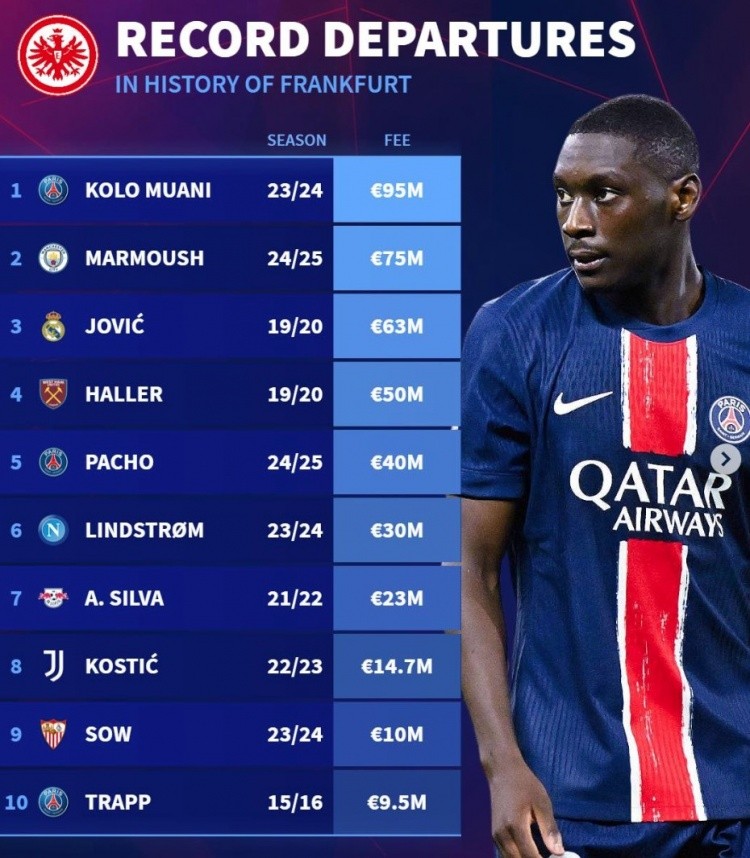 如果这笔转会按照目前的进展顺利完成,埃基蒂克有望成为法兰克福队史转出标王,超越9500万欧的穆阿尼。