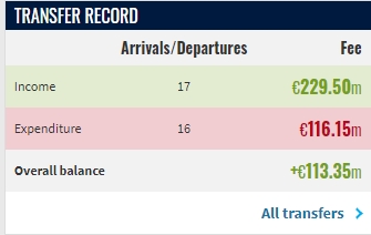 注:德转未统计阿德利转会浮动条款金额